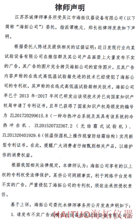 海拓儀器律師聲明:反對侵權行為 維護公司和消費者權益摘要:國內試驗設備領先者吳江市海拓儀器設備有限公司委托律師事務所發布了律師聲明,該聲明指出,當前市面上出現了產品專利侵犯海拓儀器權益,海拓儀器將以法律手段維護自身利益。該律師聲明要求某試驗設備有限公司立即停止侵權行為,扯下其在網絡平臺的相關廣告和宣傳畫冊并同時停止生產同款設備。如果該設備公司不聽勸解,海拓儀器將向人民法院依法起訴該公司侵權行為,以維護自身合法權益和維護客戶消費權益,并建議廣大消費者仔細甄別相關產品。? ? ? ?近日,吳江市海拓儀器設備有限公司委托律師事務所發布了律師聲明,該聲明指出,當前市面上出現了產品專利侵犯海拓儀器權益,海拓儀器將以法律手段維護自身利益。??事件源起于海拓儀器發現市面上有同類設備公司通過完全拷貝海拓儀器產品宣傳圖片,在微信群及該公司產品畫冊上大量發布不實廣告。??聲明指出,該廣告聲稱的在線式高低溫試驗箱的技術侵犯了海拓儀器的專利權,該產品專利由海拓儀器 -